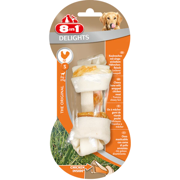 – Delights, the patented chewy bone; rawhide wrapped with chicken meat