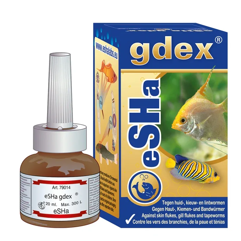 One of the many advantages is that the product can be used in combination with all other freshwater eSHa treatments. The combination of eSHa 2000, Exit and eSHa gdex gives you an extremely broad range of action. Combine eSHa gdex with Hexamita and you have a very effective medicine for Discus and other soft water Cichlids. Moreover eSHa gdex does not colour the water or lead to a bacterial bloom and is well tolerated by fish, plants, filters and shrimp.
