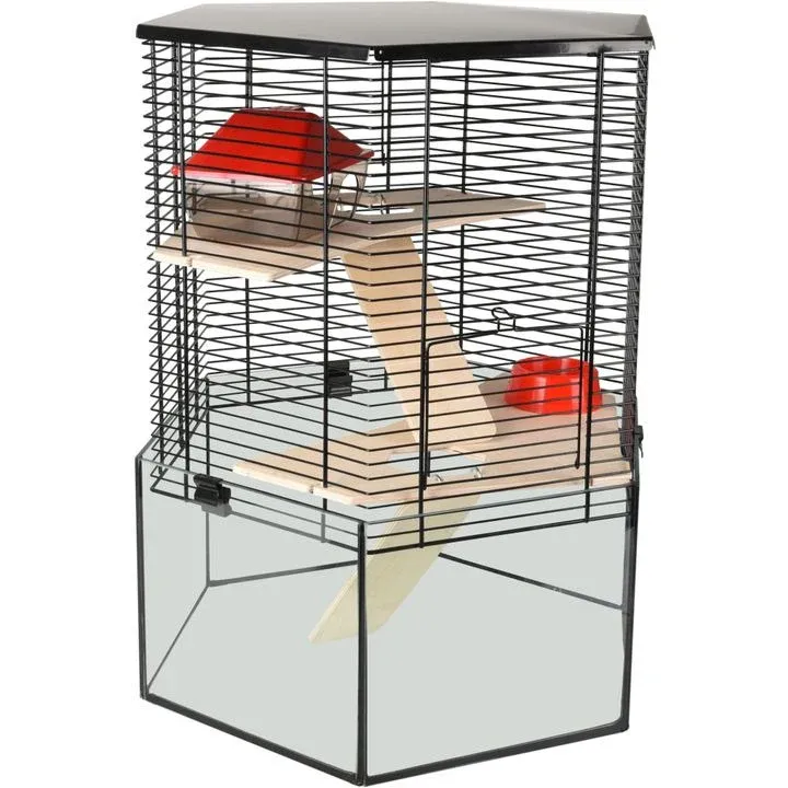 Give your hamster a luxurious stay with the Vitru hexagonal hamster cage! Complete with platforms, ramps, hiding spot, and food bowl. Easy access with 2 doors and a glass bottom. Perfect for your little buddy!