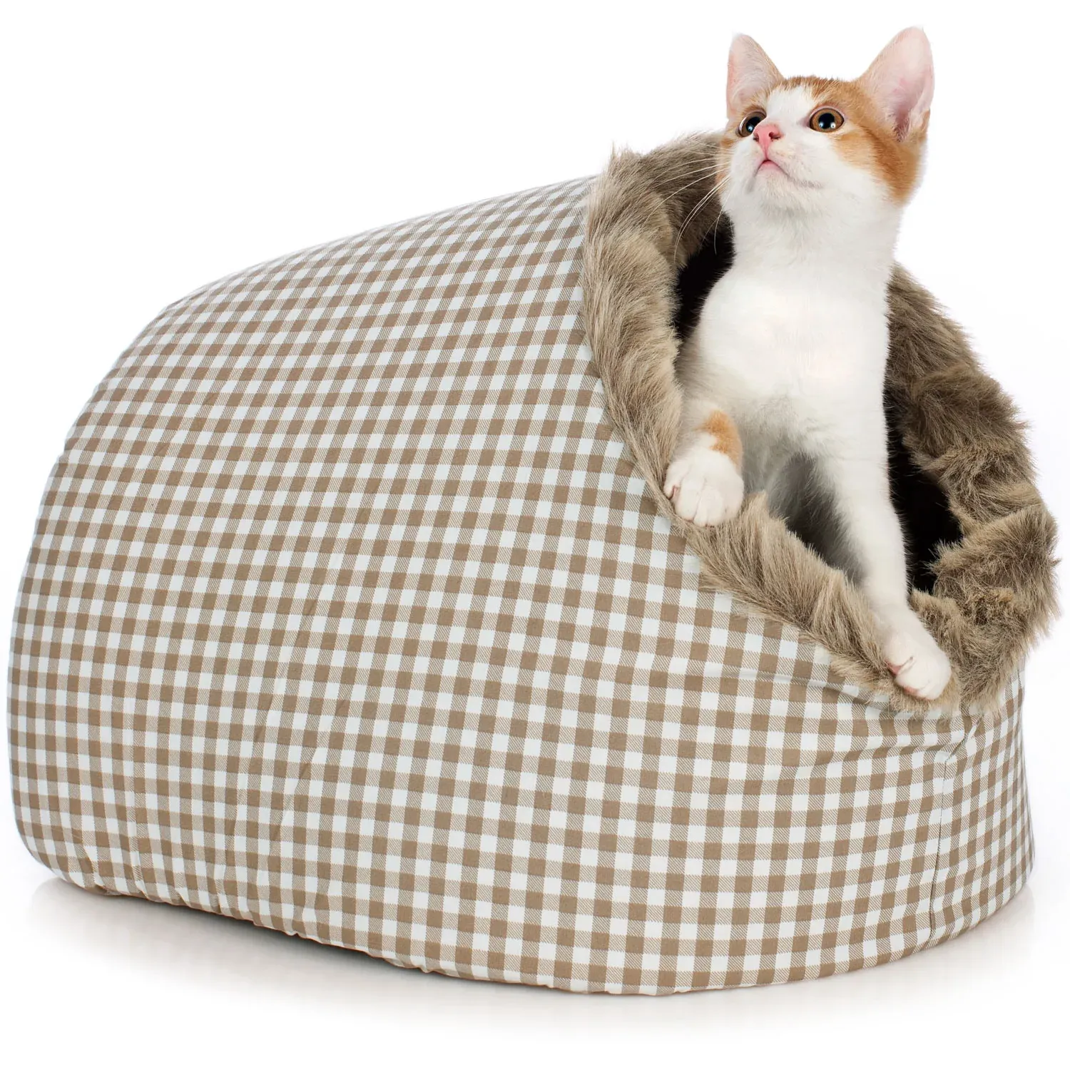 Made to feel good – ASTANA. The cosy cat cave ASTANA is dimensionally stable and also convinces with a classic check design, which fits in with any interior design – whether country house style or modern. The fluffy filling and the plush trimming at the entrance provide that certain feel-good factor. The smooth cover with cotton is pleasantly soft. When dirty, the cave can be washed at 30°C.
