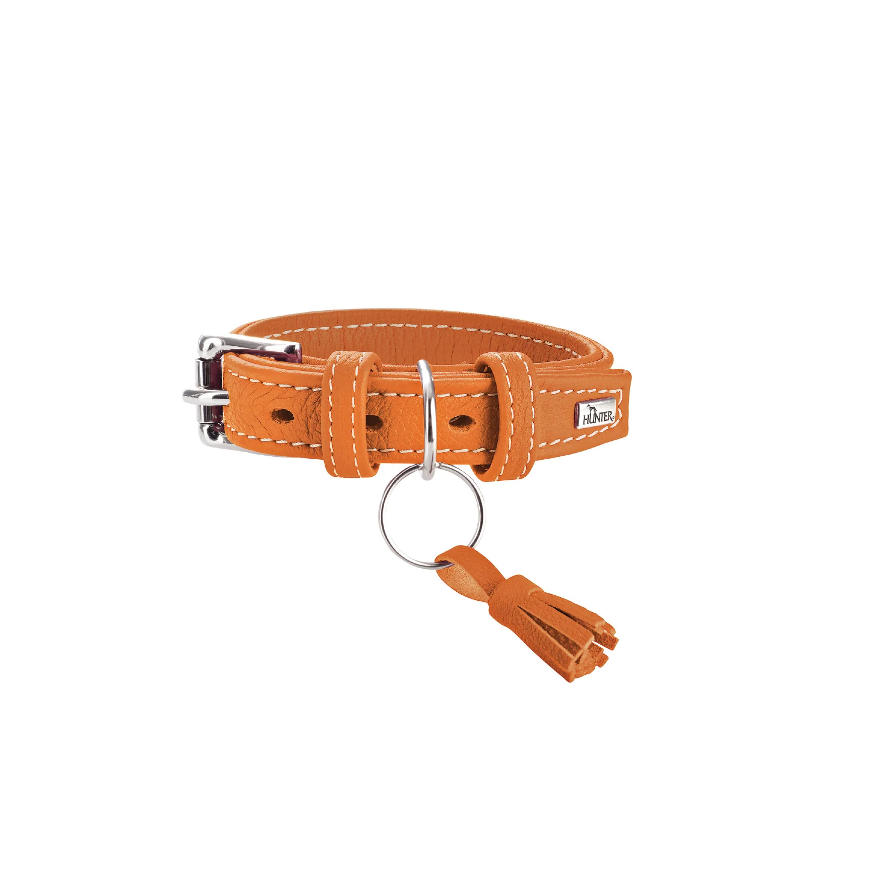 The smart tassel turns the relatively modest yet elegant cowhide nappa leather CANNES collar into a refined accessory for your dog – and since the tassel is removable, you yourself can use it as an accessory or as a keyring. Thanks to this decorative element, the look of the CANNES collar can be changed in no time at all. The CANNES collar is »Made in Germany«, which means the richly coloured beautiful cowhide nappa leather is transformed by hand into this straightforward collar that tapers slightly at each end, allowing you to open and close the fastener more easily. HUNTER ensures that all of its products are comfortable and safe for your pet. This is why, for example, every fastener and every ring is integrated with extreme care. The CANNES collar is carefully crafted out of a single piece of leather so that the leather itself becomes a wonderful piece of craftsmanship. Notice: Our leather is produced as gently as possible. With a dyed leather there may be a slight discolouration.