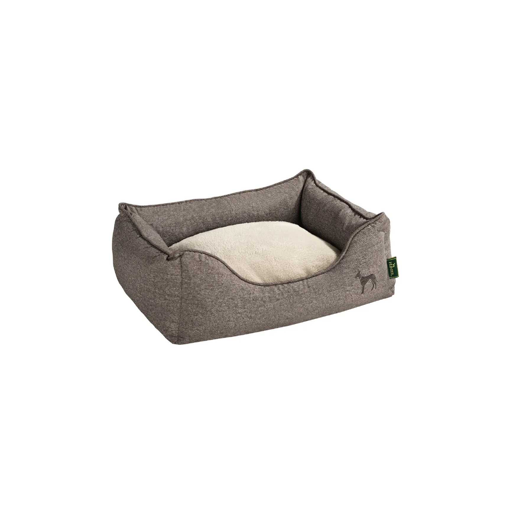Use corners sensibly – that is the motto of the LIVINGSTON dog corner sofa. The sofa inspires with an elegant, classic look, a fine textured fabric and subtle, warm colors. A small, color-matching HUNTER embroidery decorates the front in a noble way. With its special triangular shape it also fits into smaller corners. But the dog sofa is not only strikingly beautiful and practical, it is also cosy and comfortable. The fluffy filling makes it comfortable to lie on and the slightly raised edge makes for a cozy feeling. To make it easier for the dog to get in and out, the edge is flattened at the front. The textured fabric is pleasantly soft and yet very robust and easy to care for. The cover is removable and can be machine washed at 30°C. Note: Please close the zipper before washing.
