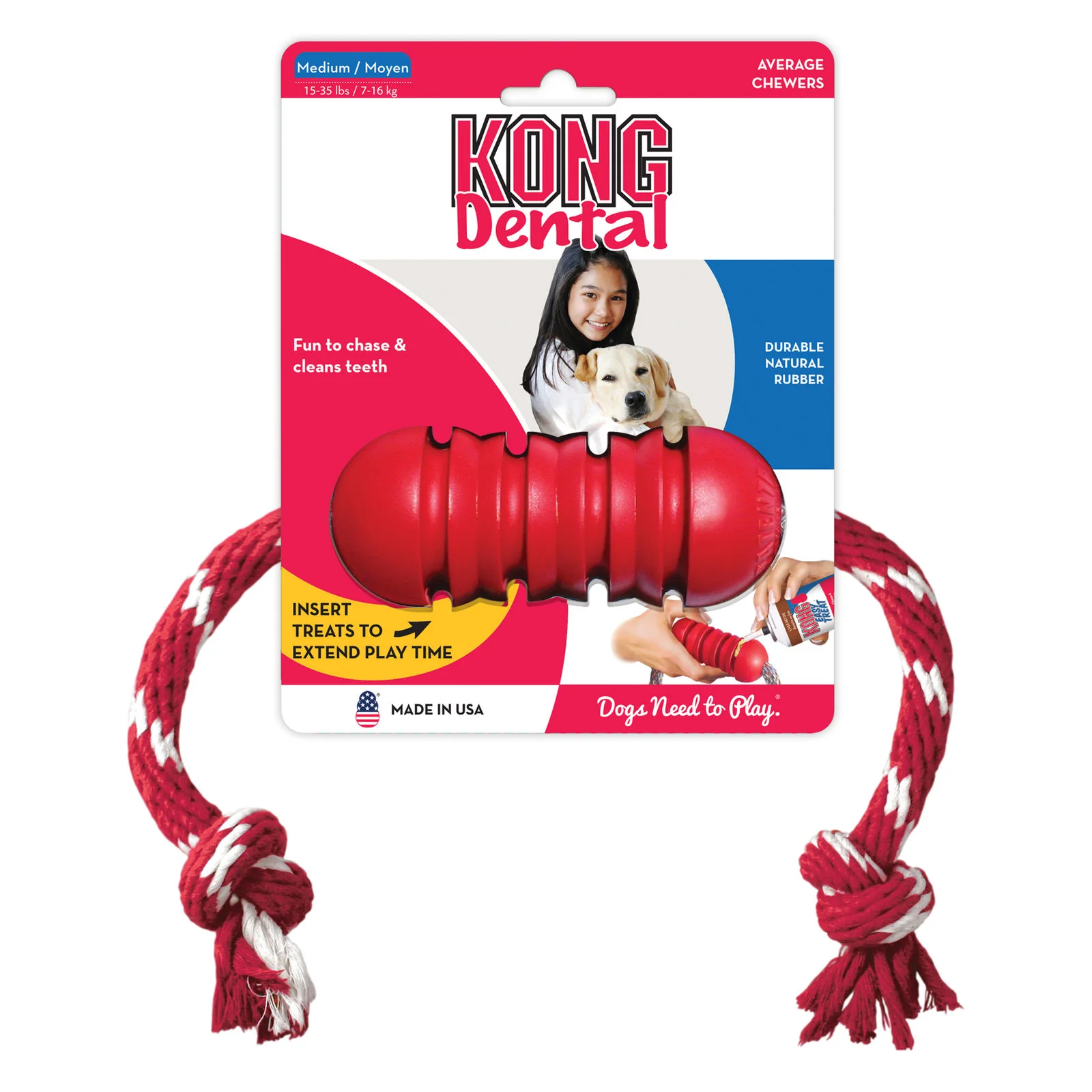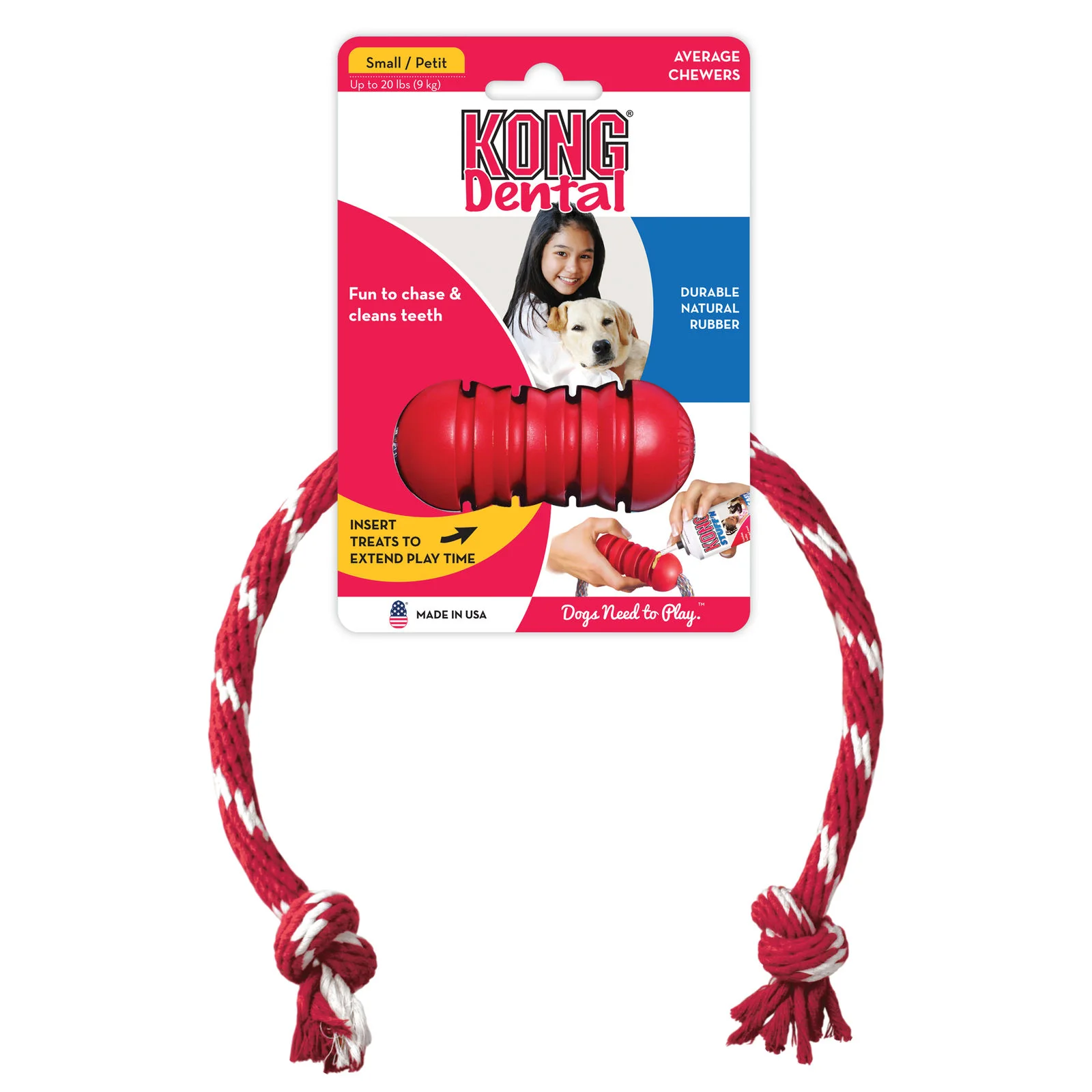 The KONG Dental with Rope toy is designed to support a dog’s instinctual need to chew while having the added benefit of cleaning teeth. Made out of KONG Classic’s unique natural red rubber formula, the KONG Dental Rope’s unique grooves give dogs an appropriate chewing outlet while the all-natural rope have the added benefit of cleaning gums and polishing teeth while your dog is delighted with the complete chewing experience. Want to extend your dog’s chew time? Want to extend your dog’s chew time? Stuff with KONG Snacks™ and entice with a dollop of KONG Easy Treat™.