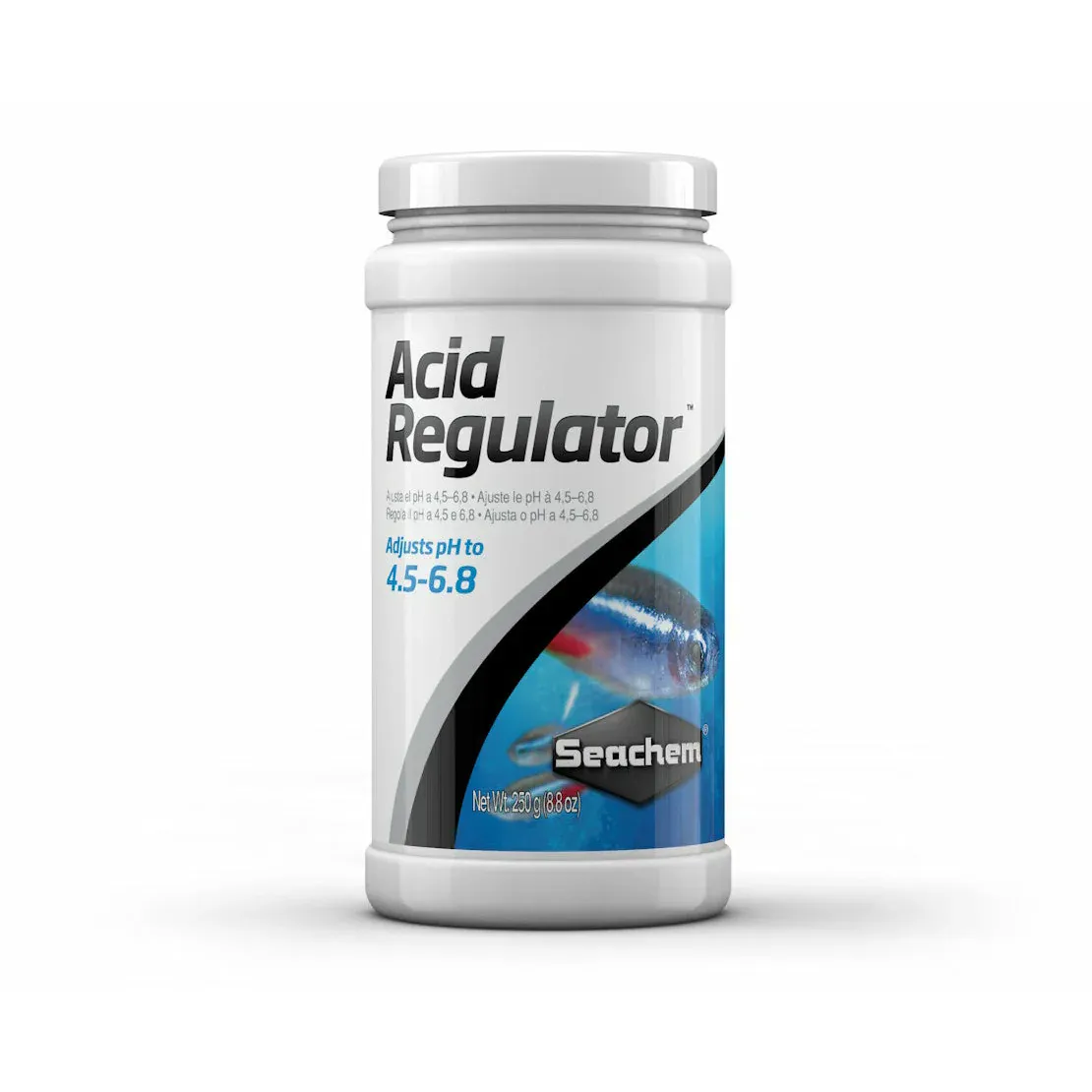 Acid Regulator™ adjusts pH to the acidic range (4.5–5.5) and softens water by precipitating calcium and magnesium. Acid Regulator™ supports the establishment of the optimal environment for all acid acclimated species (e.g. neons and other tetras, etc.). For further freshwater environment enhancement, use Fresh Trace™ to restore the proper level of trace elements and feed NutriDiet® Tropical Flakes for thriving, healthy freshwater community fish.