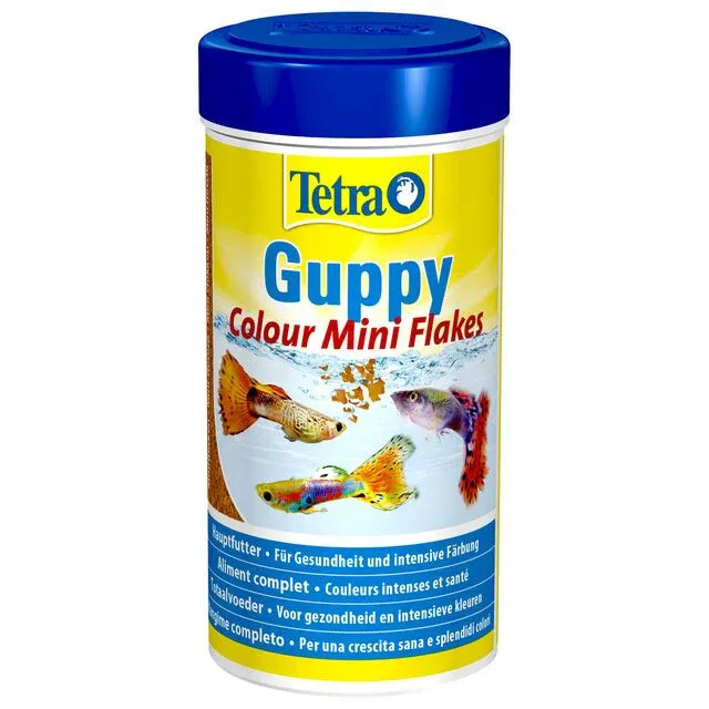 The balanced Tetra Guppy Colour mini flakes provide intense and bright colours and have been specially developed for the nutritional needs of guppies and other viviparous toothcarps such as platy, molly and swordtails. The nutrient-rich staple food contains natural colour enhancers and is optimal for the complete and daily nutrition of the fish. The mini flakes float on the water surface for a short time and then sink slowly, making them ideal for inhabitants of the upper water region. The size of the flakes is adapted to the small mouths of the fish, making it easier for them to feed. The special nutrient composition ensures the best possible supply for the fish. The food has a high content of vegetable components and added minerals. These ensure improved acceptance and promote the growth of the fish. The BioActive formula supports a healthy immune system.